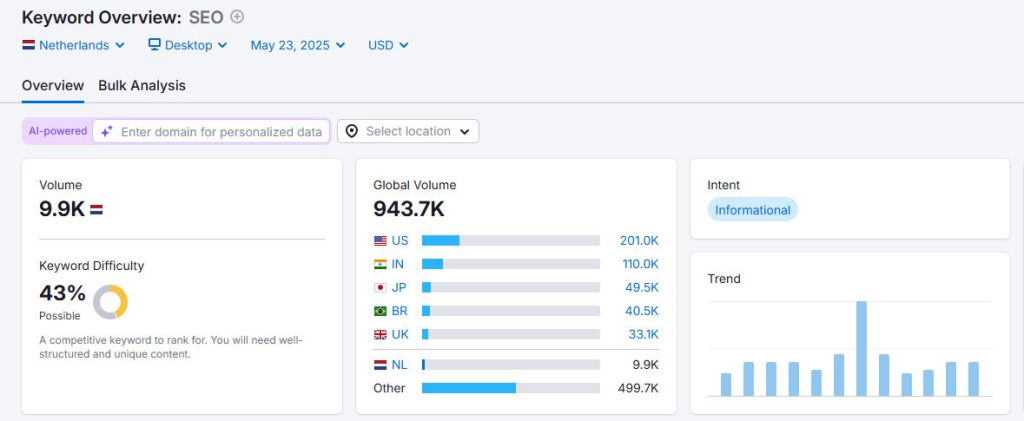 De concurrentie wordt weergegeven in de Keyword difficulty: een score van 0 tot 100, waarbij geldt: hoe hoger de score, hoe moeilijker het is om met je website op een bepaald zoekwoord in de top 10 van de organische resultaten in Google te eindigen.